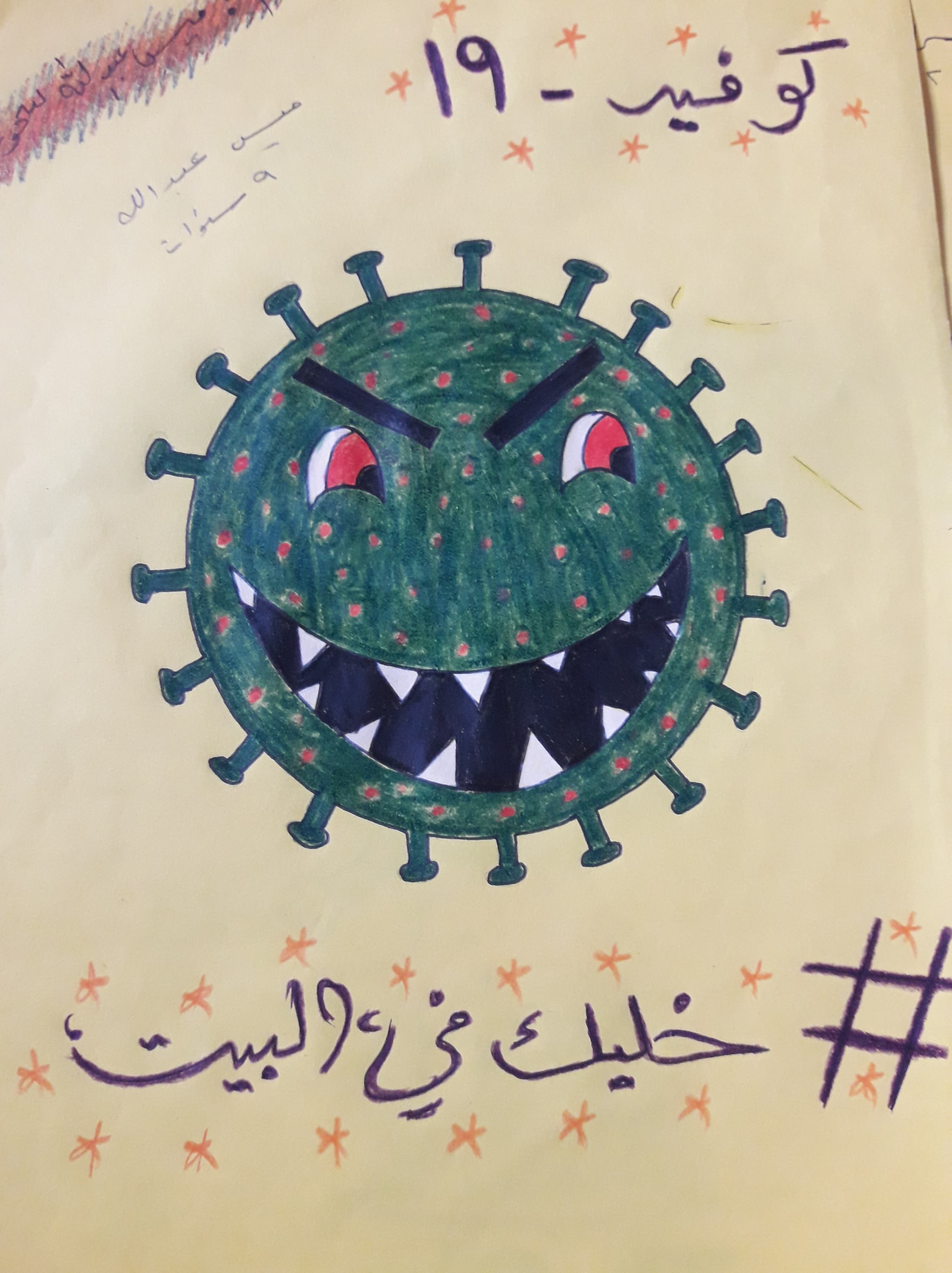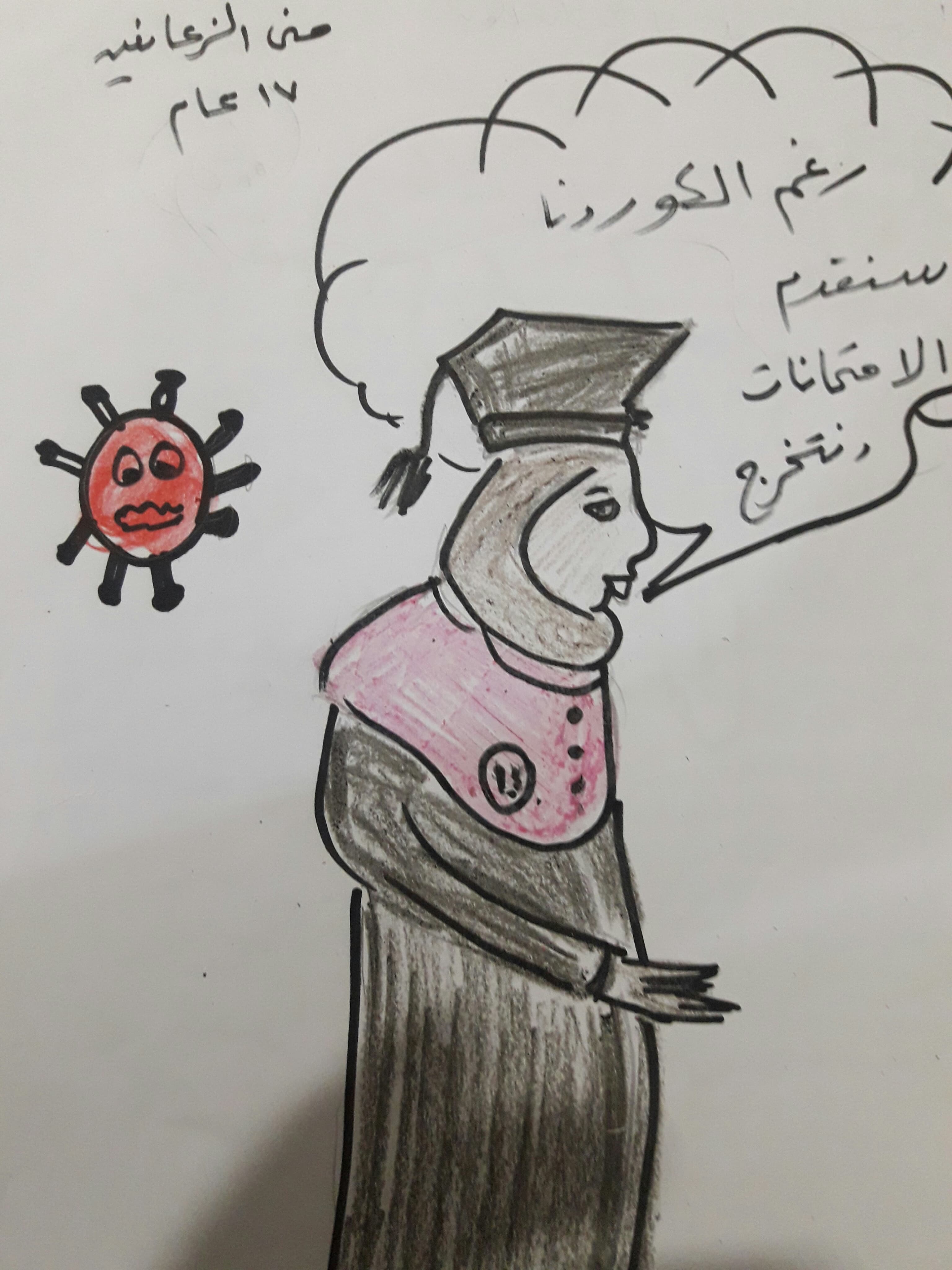 اشعر بالحزن الشديد لان كل الاماكن مغلقة حتى المدرسة المكان الوحيد الذي كنت اذهب اليه لارى صديقاتي واتعلم رغم انني لا احب المدرسة كثيرا ففيها بنات لا يحبونني لأنني فقيرة وملابسي ليست كملابسهم فانا اخذ ملابس المدرسة من ابنة خالتي عندما تصبح صغيرة عليها لكن كانت المدرسة هي المكان الذي التقي فيه بحنان صديقتي الغالية لكن الان بلا مدرسة ولا سوق ولا محال تجارية حتي بائع غزل البنات اغلق محله. اشعر بالبؤس وعندما اتحدث مع بنت جيراننا دانا من الشباك تقول انها سعيدة في الاجازة لان لديها انترنت تتحدث مع صديقاتها عبره ليت هذا الفيروس لم يأت ليحرمني مدرستي وصديقاتي لكني سررت عندما اعلنوا ان المدرسة ستكون في شهر ثمانية ساراك عزيزتي قريبا بدون مرض ولا فايروس.