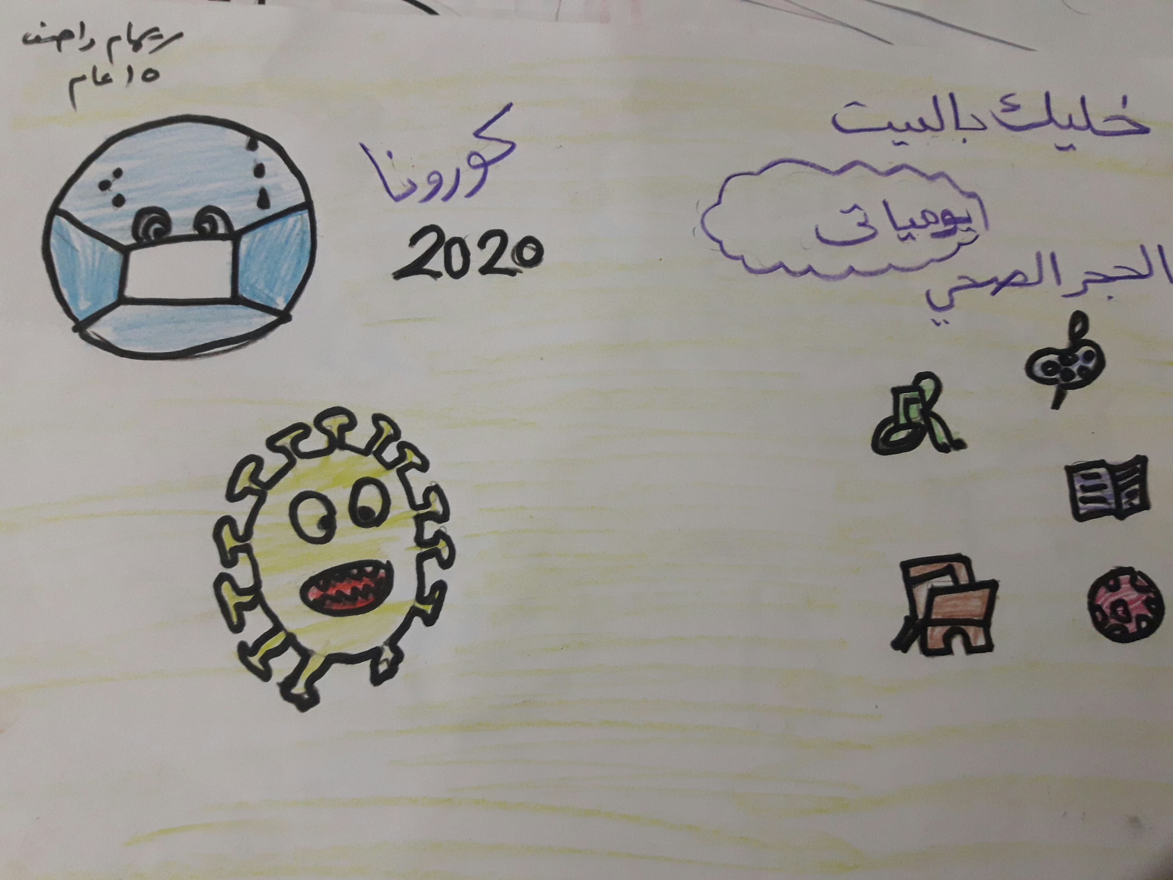 طول الوقت ونحن في البيت خلال الحجر. في اول الحدث كنت اقضي اغلب الوقت في النوم ولكن بعد ان تواصلت مع امينة المكتبة في جمعية العطاء وقالت انه بإمكانهم ان يرسلوا لنا قصصا وكتبا وكراسات للرسم ونحن في البيت، فرحت كثيرا فأصبحت انا واختي رؤيا نقوم باستعارة القصص وقراءتها وتنافسنا حول المطالعة والقراءة ولعبنا ورسمنا ولم نشعر ان وقت الفراغ ذهب سدى بل استفدنا كثيرا