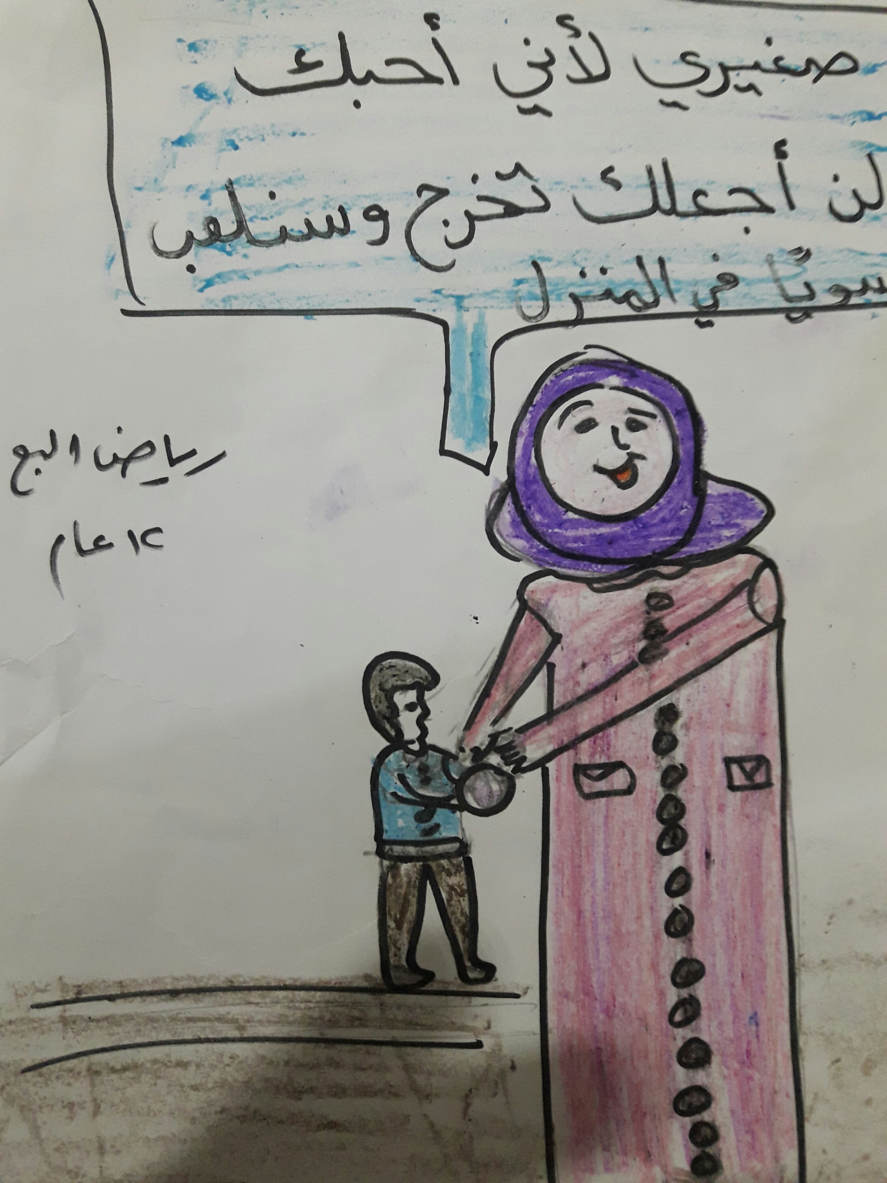 عندما اعلن الحجر الصحي سمعت ابي وامي يتحدثان كيف سنأكل ونشرب بدون عمل ونحن في الحجر الصحي. ولكن انا حملت لهما بشارة الخير فلقد سمعت في الاخبار ان الحكومة ستقوم بتوزيع ما يلزم للعائلات خلال الحجر الصحي، لكن امي وابي ضحكا ولم تكن ضحكة مفرحة فقالت امي نحن في حصار وجوع ومأساة منذ عهد طويل ولم يساعدنا احد ولن يستطيع احد ان يساعدنا.